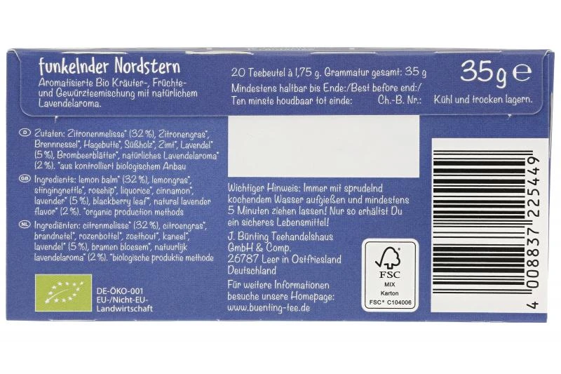 Funkelnder Nordstern. Dein Guten-Abend-Tee. Mache es zu Deinem Abentritual und entspanne Dich mit Deinem Guten-Abend-Tee mit Zitronenmelisse und Lavendel. Der beruhigende Duft lässt Dich den Alltagsstress vergessen und hilft Dir, den Tag ruhig ausklingen zu lassen.
